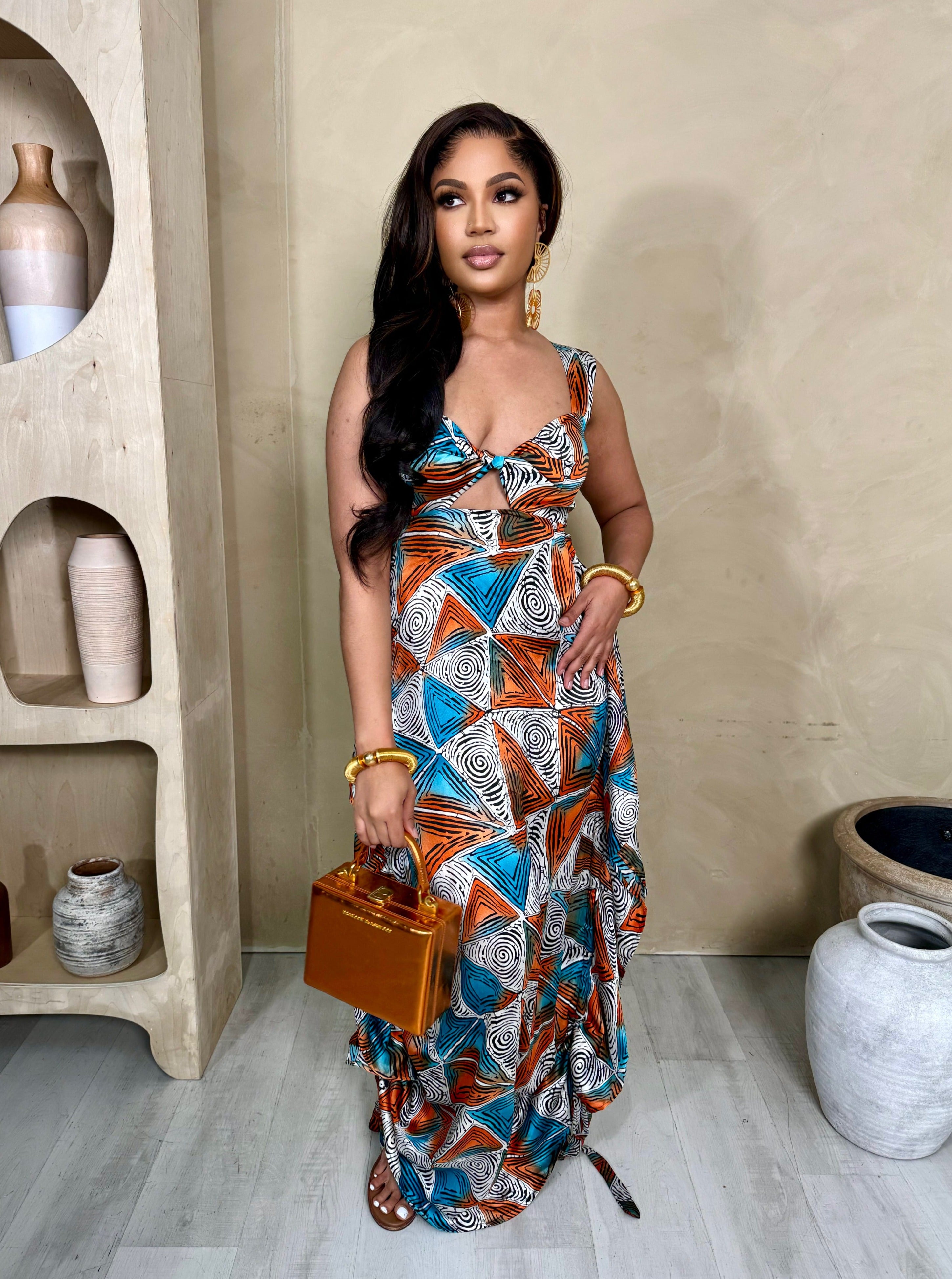 Twist-Front neck line style, Maxi dress with adjustable drawstrings at the sides to adjust the length of the dress
