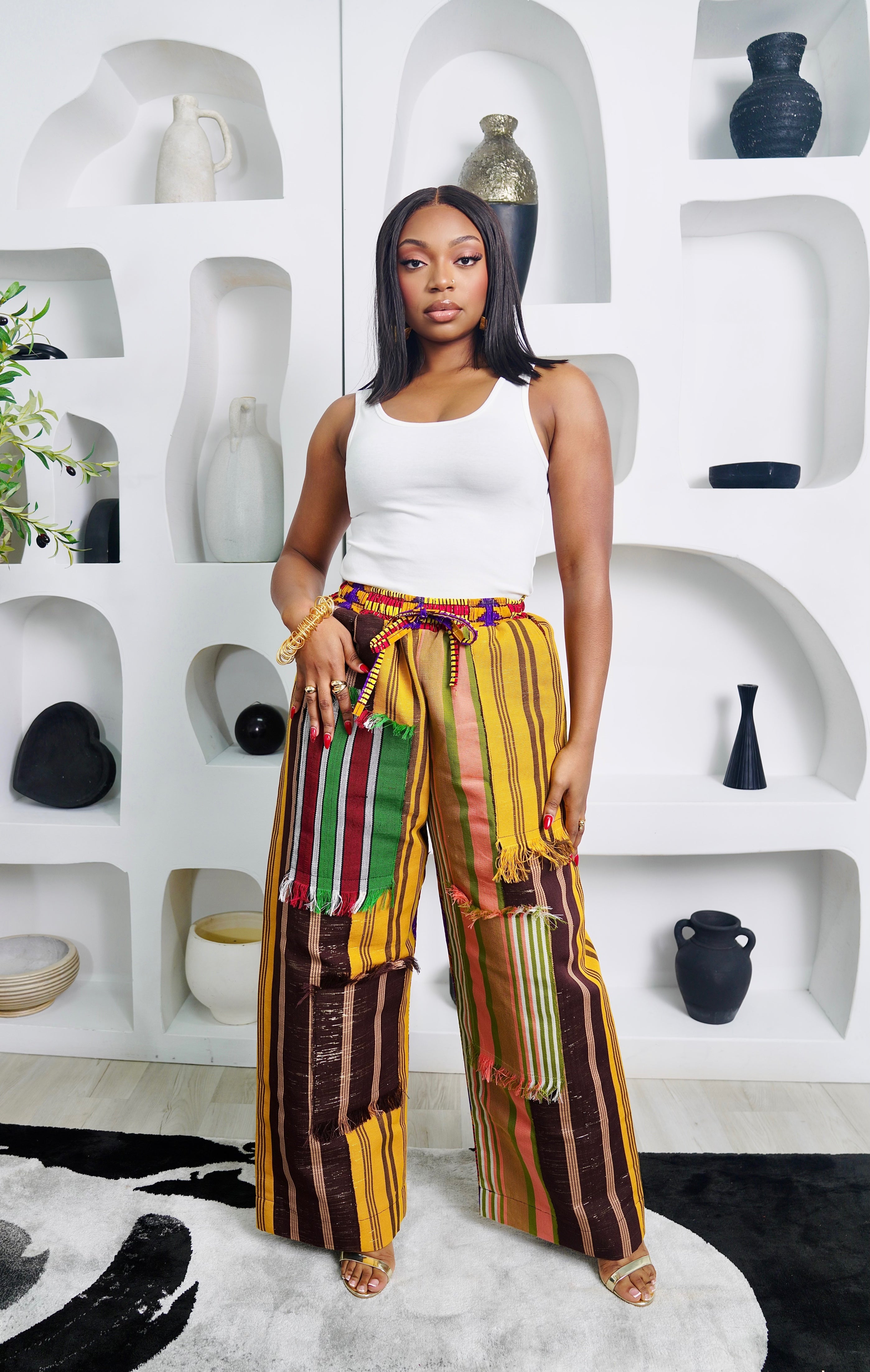 Structured yet easy to wear, REWA CARGO PANTS blends heritage craftsmanship with street-ready style. Crafted from handwoven African textiles, these statement trousers bring bold stripes, rich earthy tones, and vibrant patchwork to life.